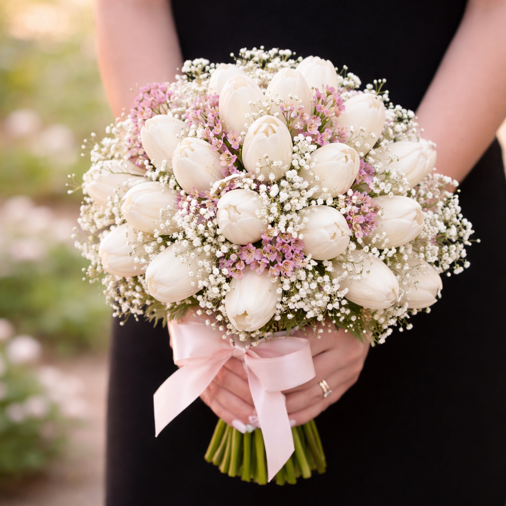 30 White Tulips with Baby's Breath Bouquet